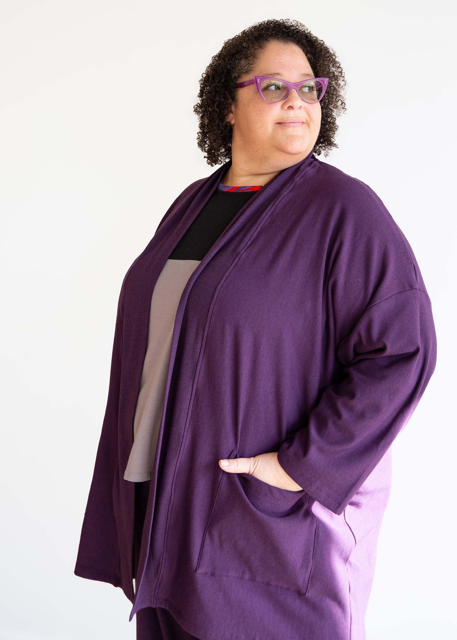 I barely had my outer jacket off when someone commented about how fun my Brenda Boxy Jacket was! It is soft and comfortable but so chic and fun. It is a jacket and a cool accessory all in one. I also love the rich, bold purple as the main colour as well.