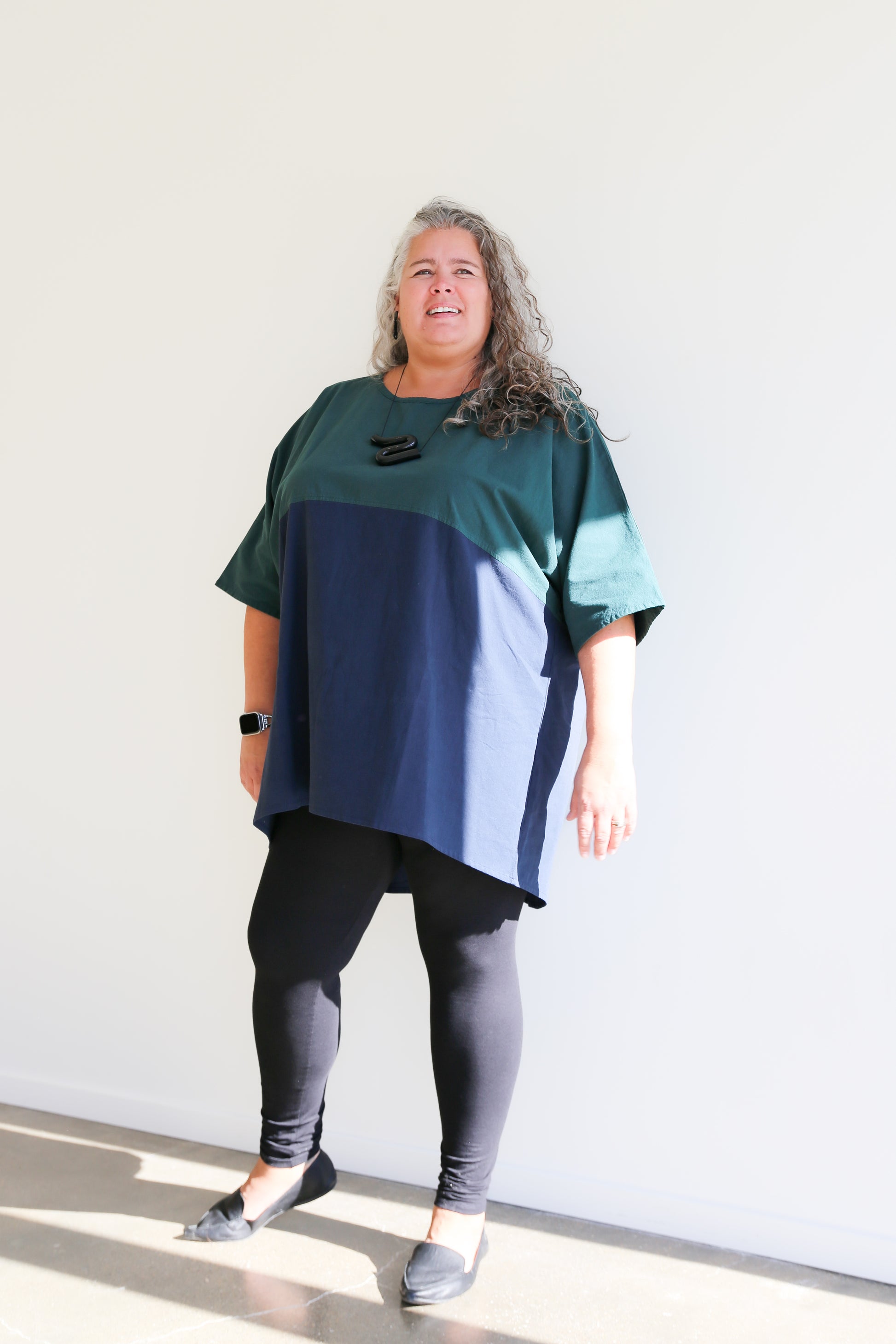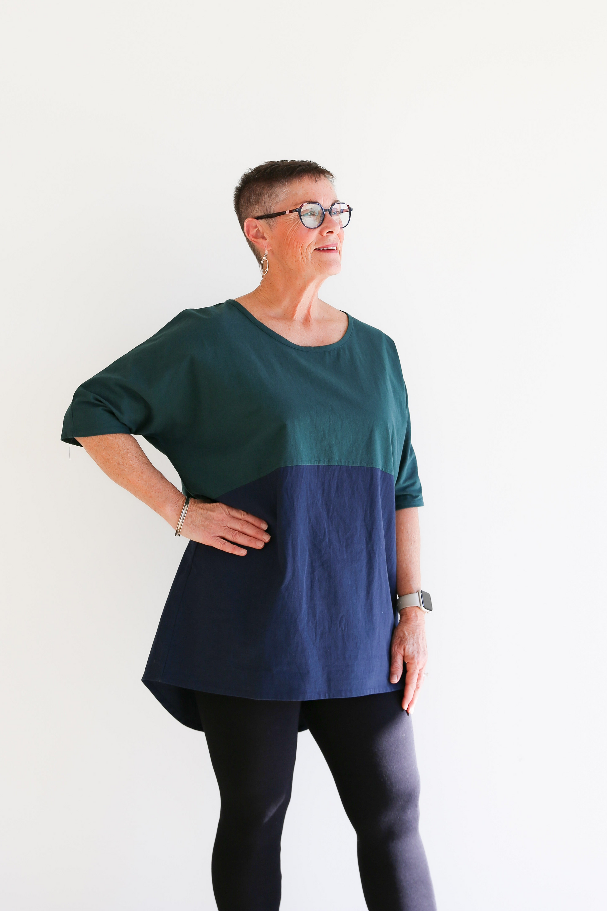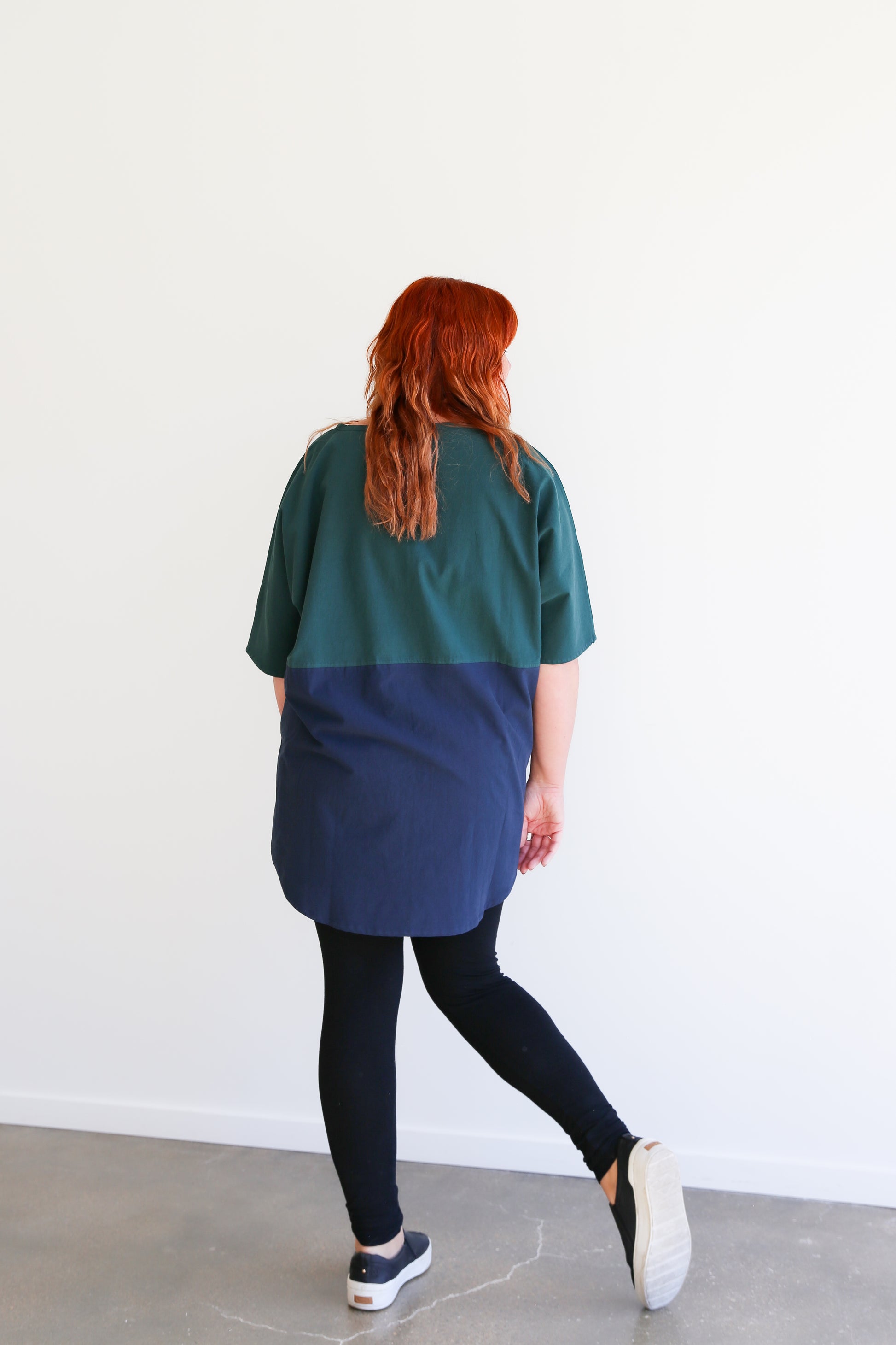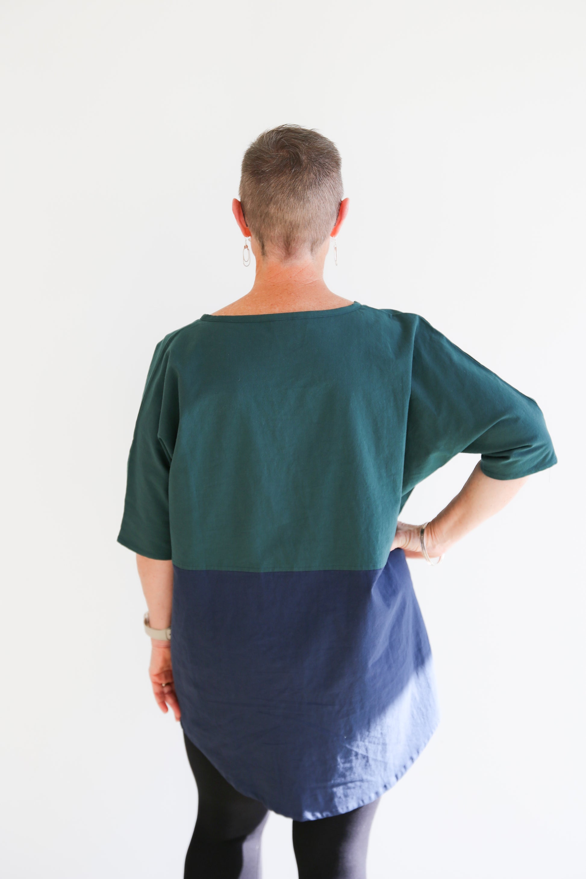 Stunning in the Pine and Navy colour combination, this top is gorgeous for fall. It is in the brushed cotton fabric and is so soft but with a little bit of structure, almost like a casual dress shirt. Featuring a slight grown on sleeve, scoop neck and a high/low scoop hem. Color blocking is subtle and yet still fun. Long enough to wear with leggings, but also cute to wear with jeans or even a great pair of dress pants or a peg skirt.