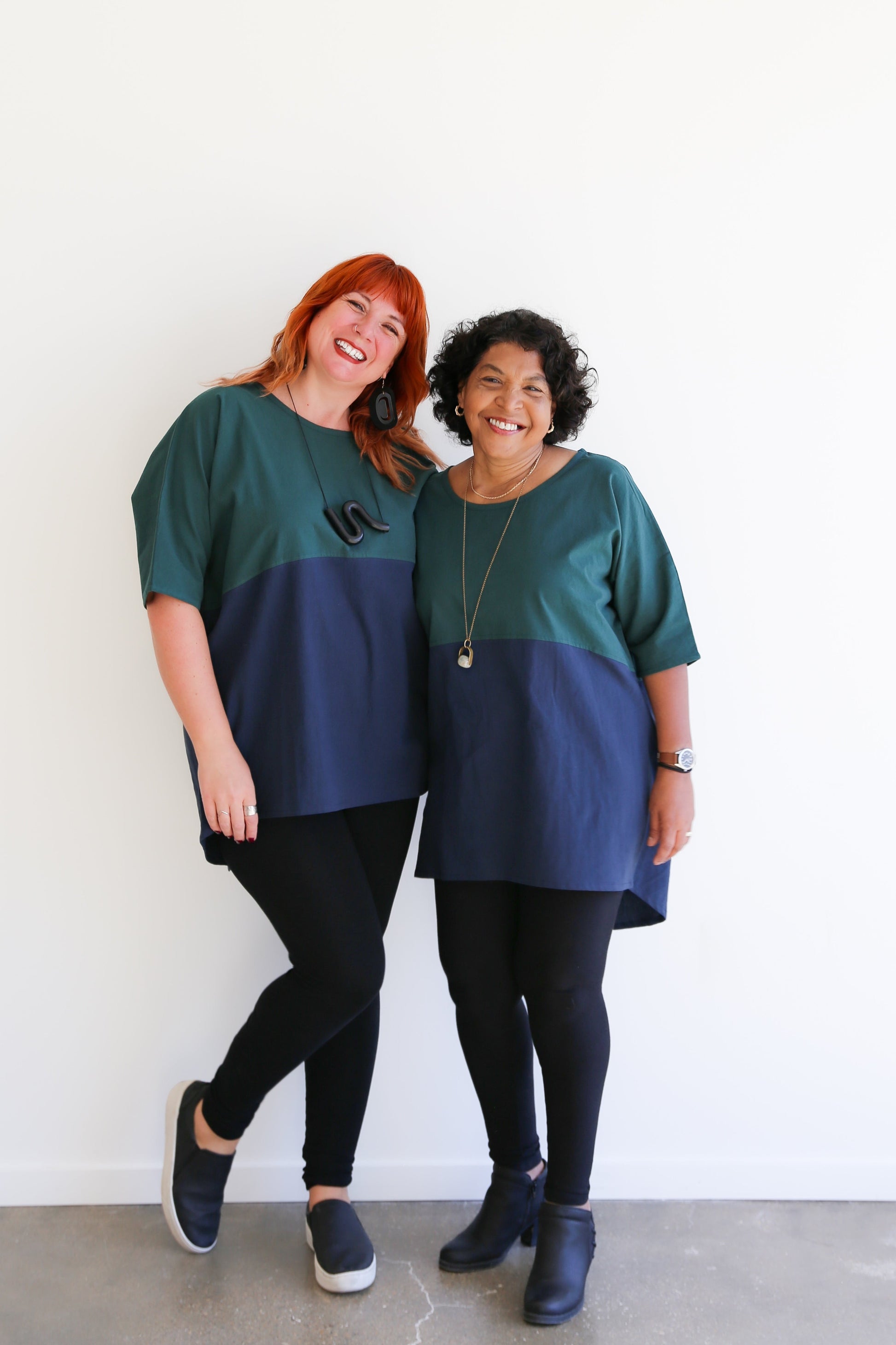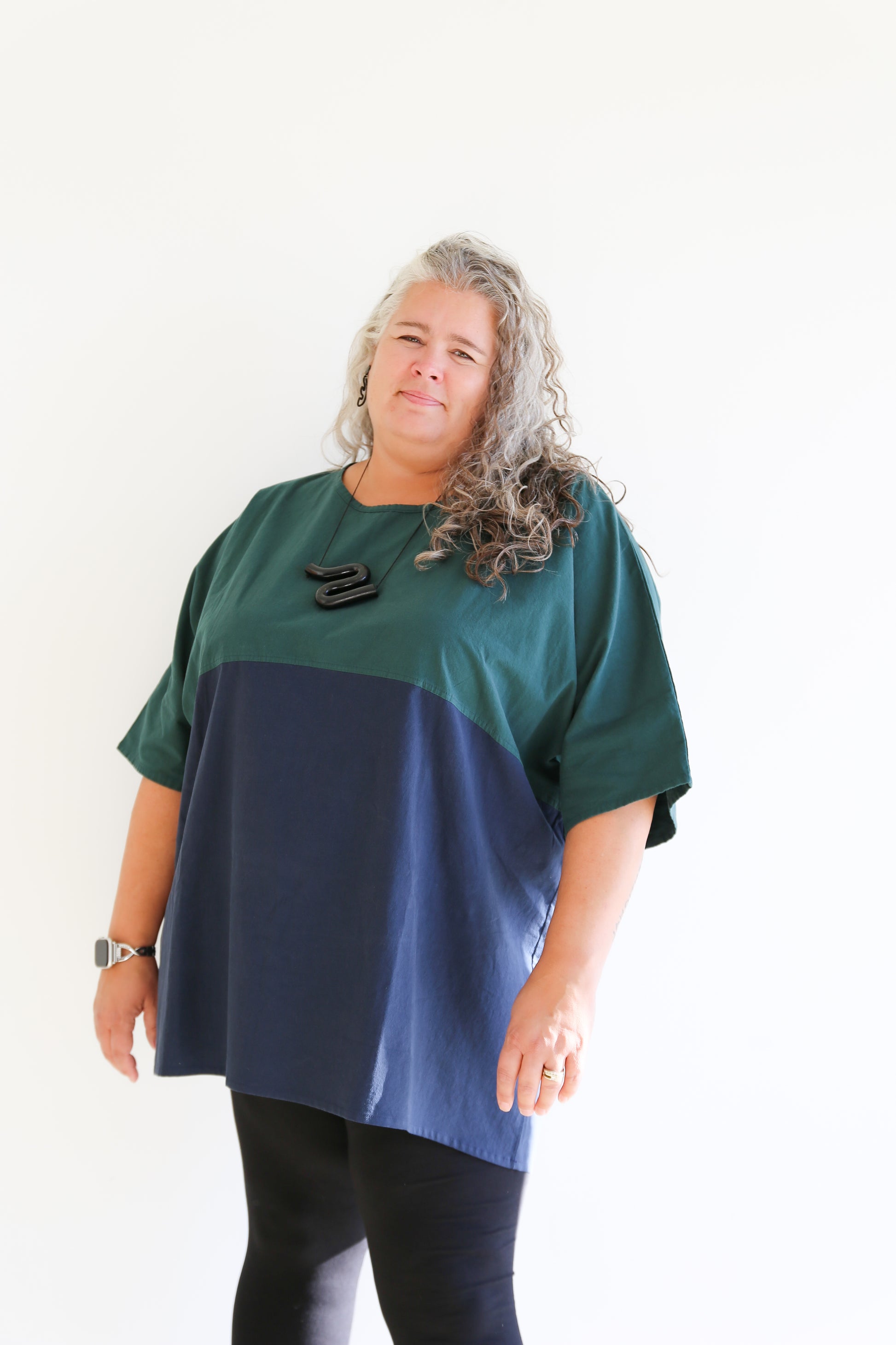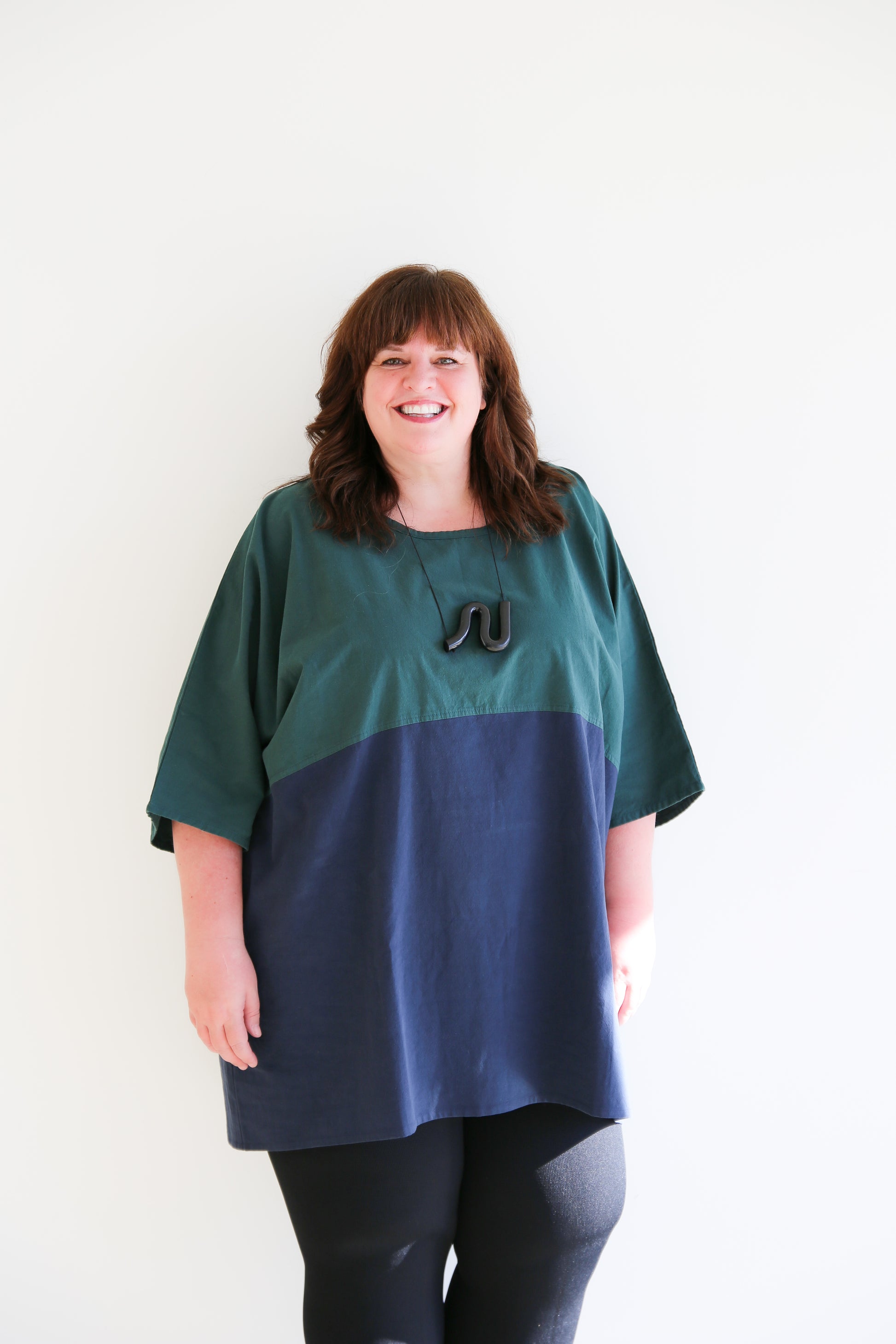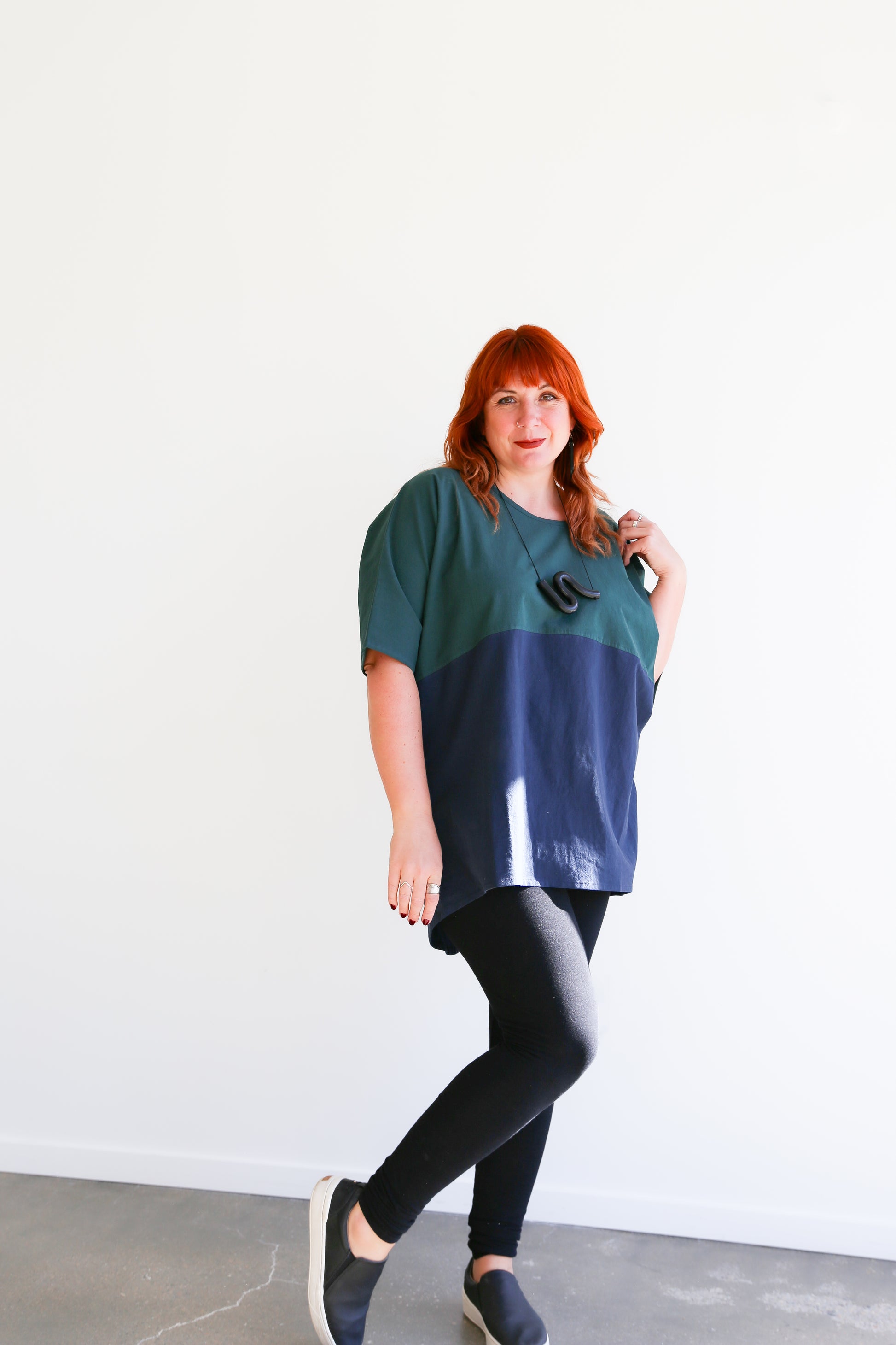 Stunning in the Pine and Navy colour combination, this top is gorgeous for fall. It is in the brushed cotton fabric and is so soft but with a little bit of structure, almost like a casual dress shirt. Featuring a slight grown on sleeve, scoop neck and a high/low scoop hem. Color blocking is subtle and yet still fun. Long enough to wear with leggings, but also cute to wear with jeans or even a great pair of dress pants or a peg skirt.