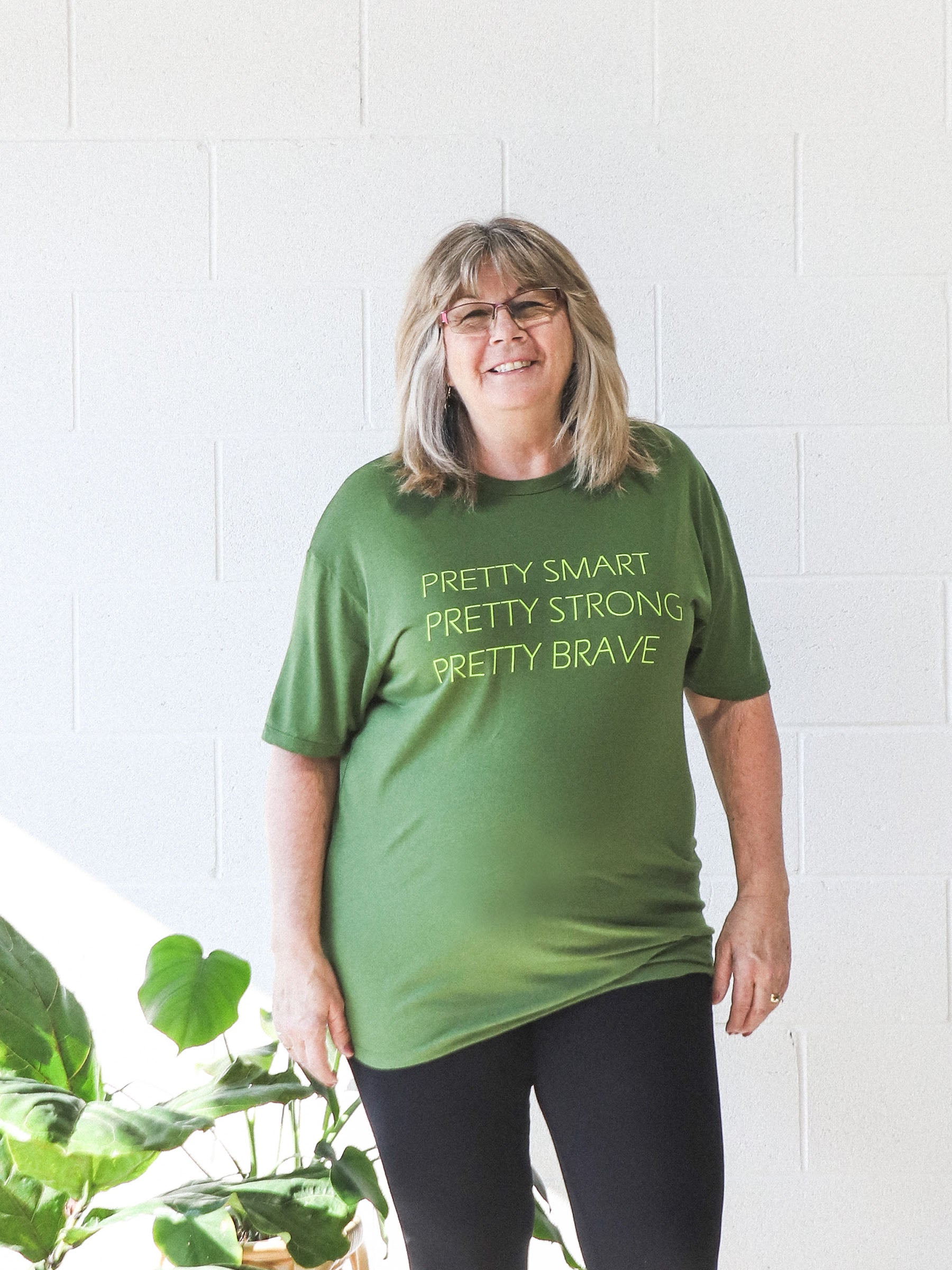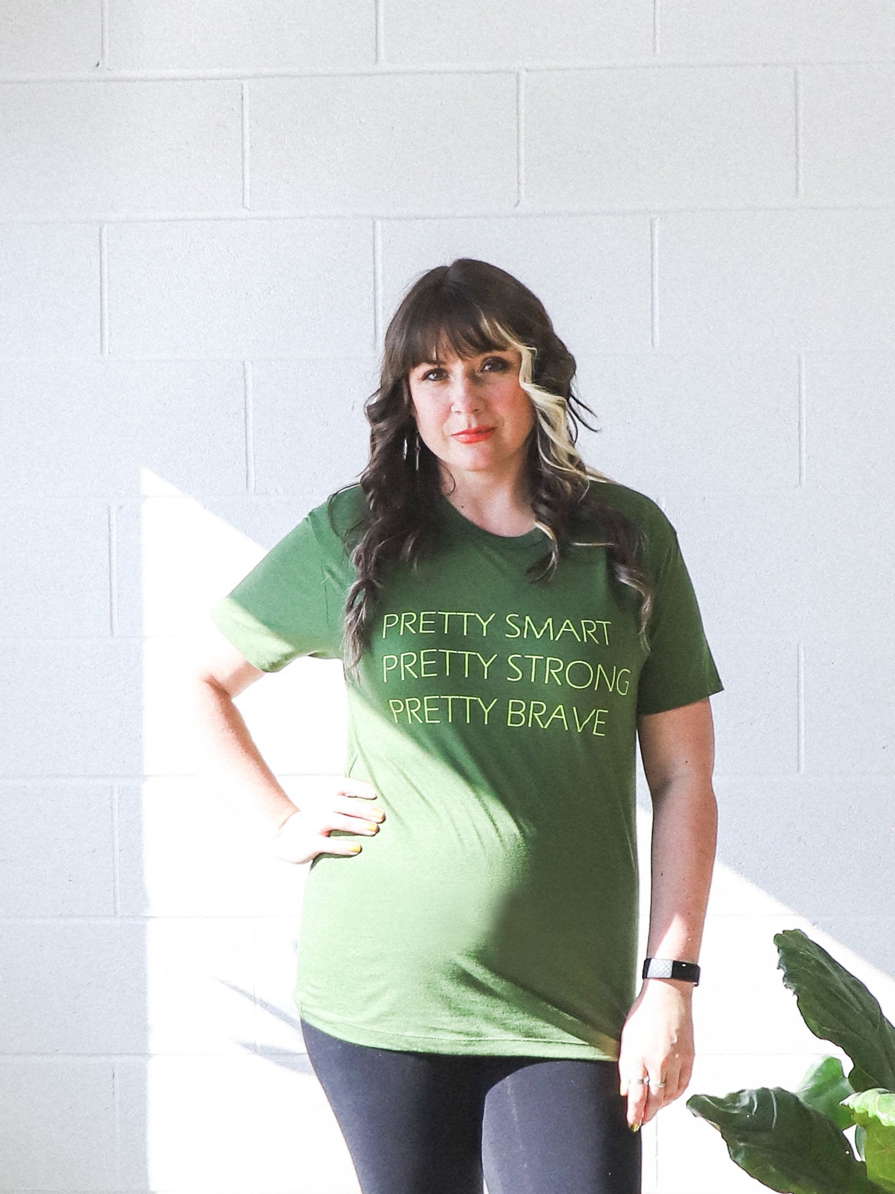 We just love this olive green shade and had fun with the bright chartreuse printing! Available in unisex sizing XS-5X and children and youth available too, click here.
