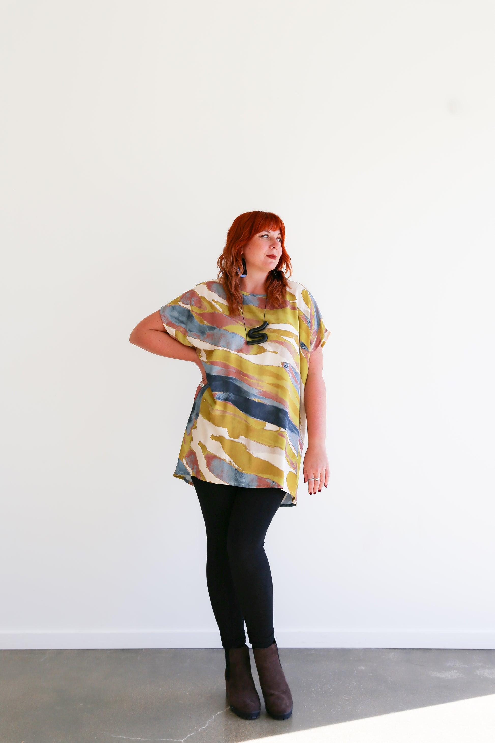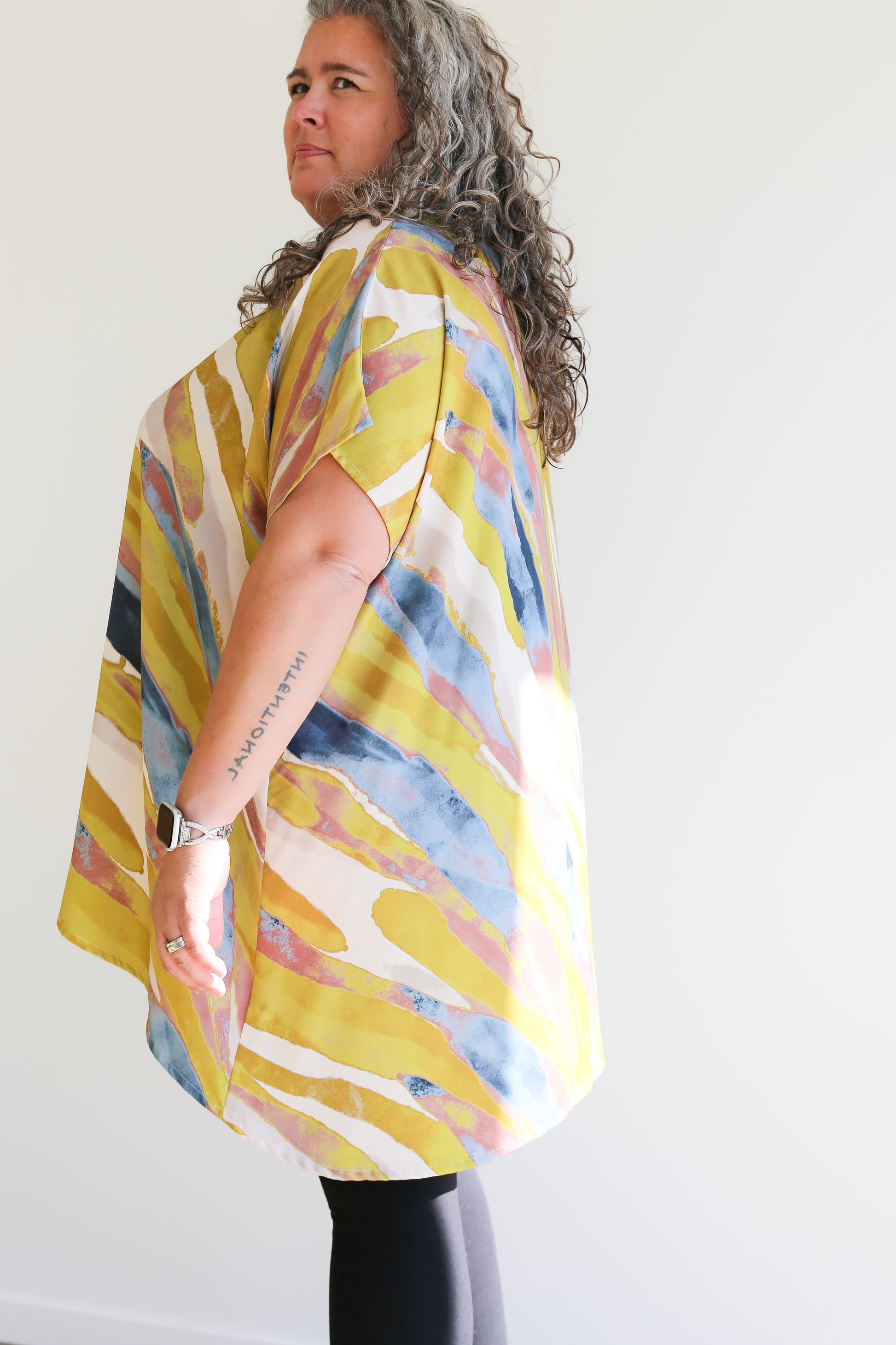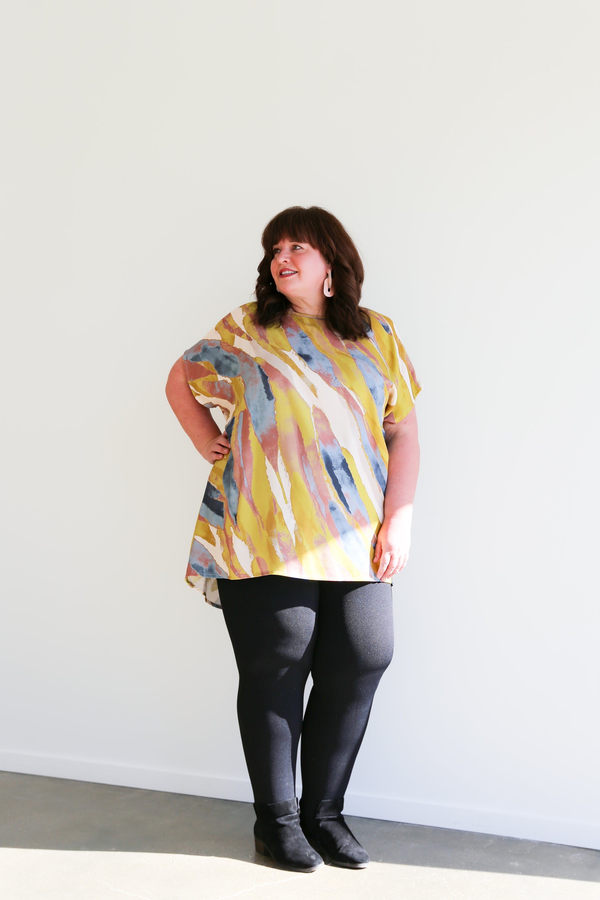 This is the Sheila Tunic Top that debuted last year in another print that sold out because it was so gorgeous on so many different people. It is back this year by popular demand, now in this beautiful new print. Featuring a slight grown on sleeve, scoop neck and a high/low scoop hem. It feels so comfortable on, but definitely looks dressier so perfect for an evening out.