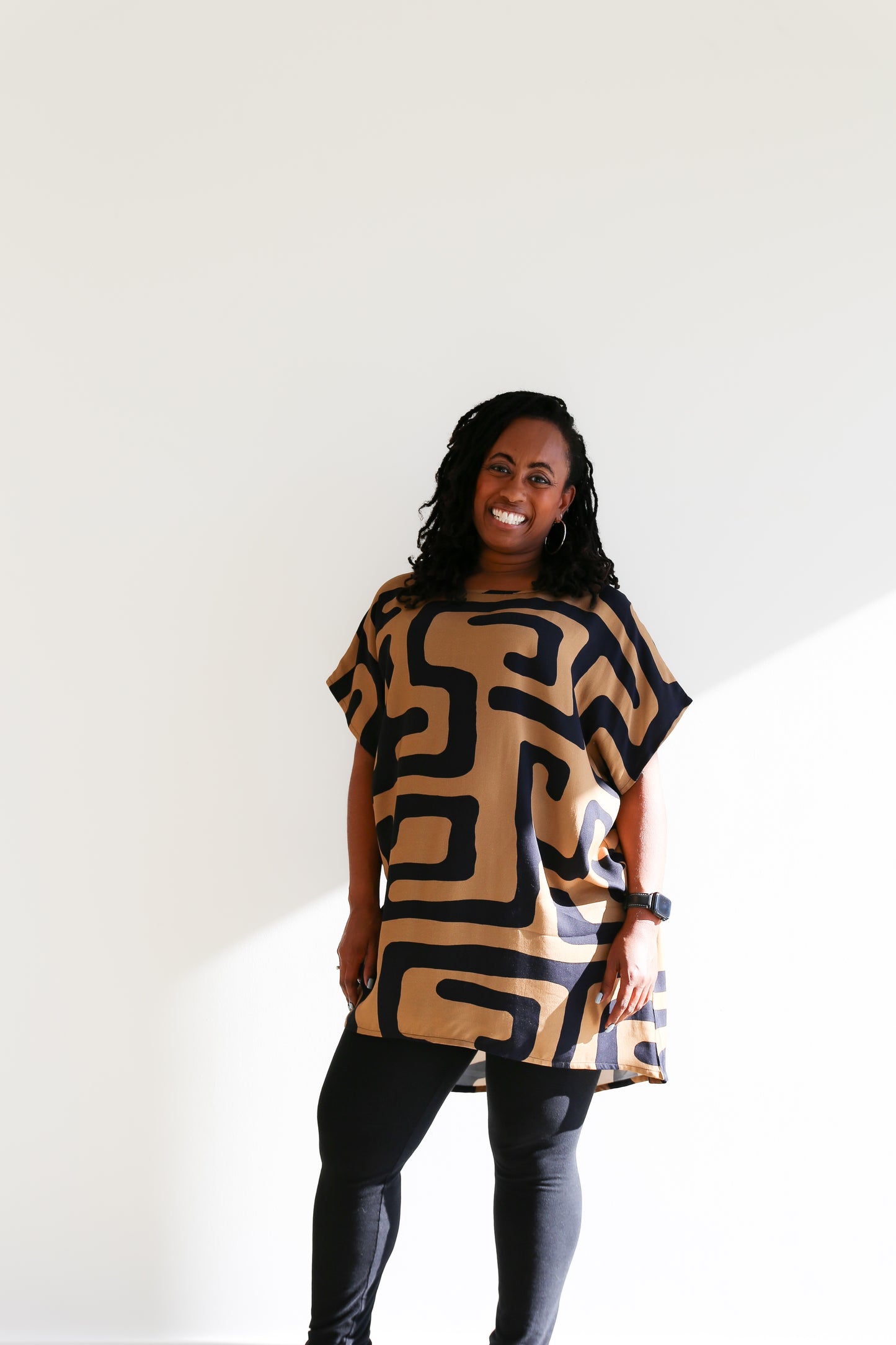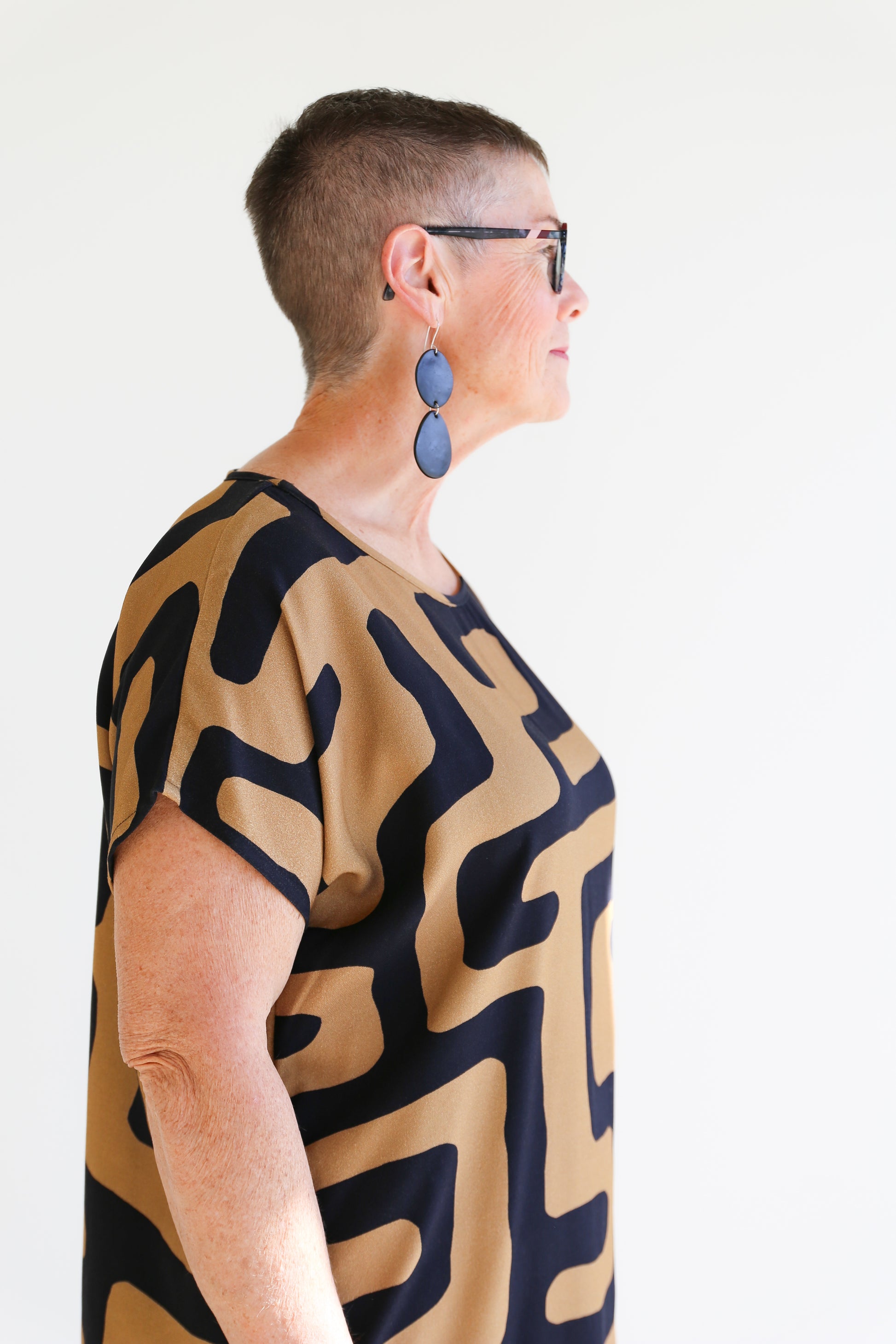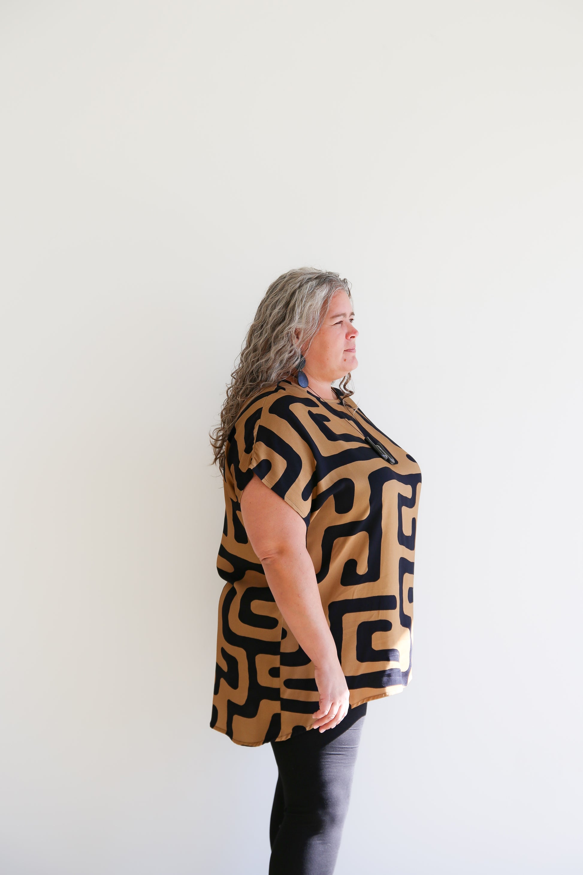 Hello stunning new print! This Gold & Black print in the Sheila Tunic is gorgeous with rich bold colour contrast. The geometric shaped print looks modern and yet minimalist all at the same time. It’s very elegant and sophisticated so it would be perfect coming into holiday season to wear to any parties or events.